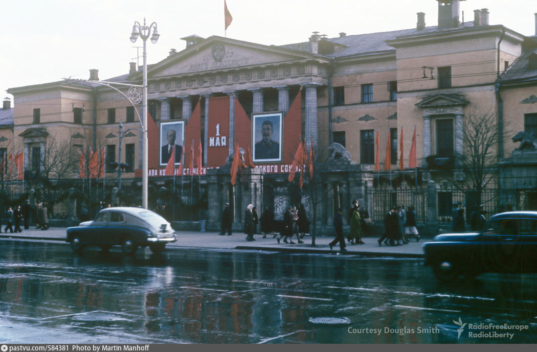 Давайте совершим очередное путешествие сквозь время, прогуляемся по улицам родного города, посмотрим, как была жизнь в те годы и что изменилось за прошедшие десятилетия. Поехали! ... Страна Советов первый год без Иосифа Сталина празднует 1 мая, но его портретами всё ещё украшают фасады зданий. Это музей на улице Горького, ныне Тверской, недалеко от Пушкинской площади. Фото 1954 года, Мартин Манхофф Вид с этой точки сейчас. В этом здании и сейчас музей, только другой, а фасады зданий уже давно не украшают портретами вождей мирового пролетариата Праздничные гуляния 1 мая на улице Горького / Тверской. Слева за кадром здание Моссовета, ныне Мэрии Москвы. Женщина у забора продаёт бутерброды, пирожки и напитки. Фото 1954 года, Мартин Манхофф Здесь вид почти не изменился, но справа за кадром ещё в советские годы был установлен памятник Юрию Долгорукому. Кстати, впереди по ходу движения исчезло здание гостиницы, его лет пятнадцать назад разобрали Это таже точка, только вид с другого ракурса, в