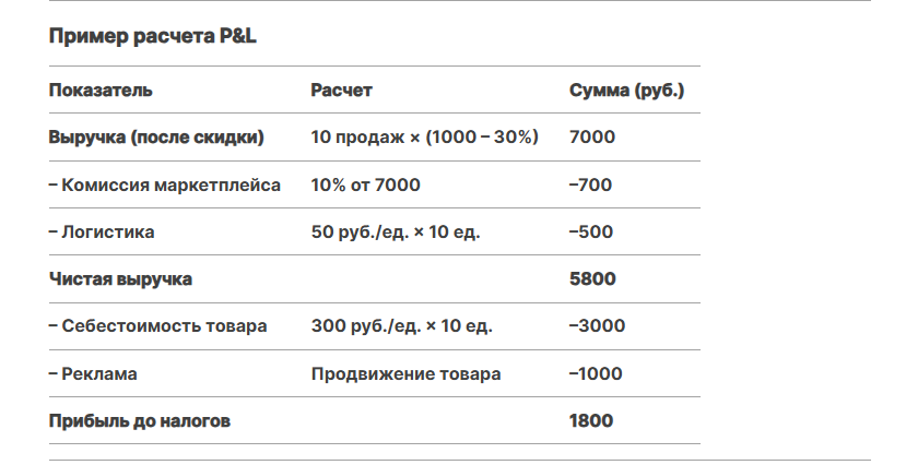 Штрафы (если есть).Пример:CopyВыручка = (Цена товара после скидки × Количество продаж) – Комиссия маркетплейса – Логистика - Себестоимость товара: