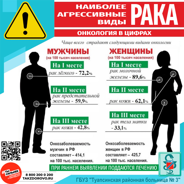 Есть виды рака, которые отличаются повышенной агрессивностью, они плохо поддаются лечению и довольно быстро дают метастазы, поэтому для человека критически важно определить их на как можно более ранней стадии. Наиболее агрессивными видами рака онкологи сейчас считают рак желудка, поджелудочной железы, легкого, яичников, а также меланому. Например при раке молочной железы, даже в той стадии, когда уже пошли метастазы, имеется много шансов выжить, а если речь идет о раке желудка в той же стадии, то прогноз крайне неблагоприятный. Сейчас онкологи научились неплохо лечить лимфому, даже когда рак захватил почти все лимфоузлы, то благоприятный исход может быть вероятен. К сожалению, в случае рака легкого, такой уверенности у врачей нет. Несмотря на то, что методы лечения постоянно совершенствуются, наибольшую эффективность терапия дает на начальных стадиях болезни, поэтому рекомендуем своевременно проходить профмедосмотр и диспансеризацию. #укреплениеобщественногоздоровья
