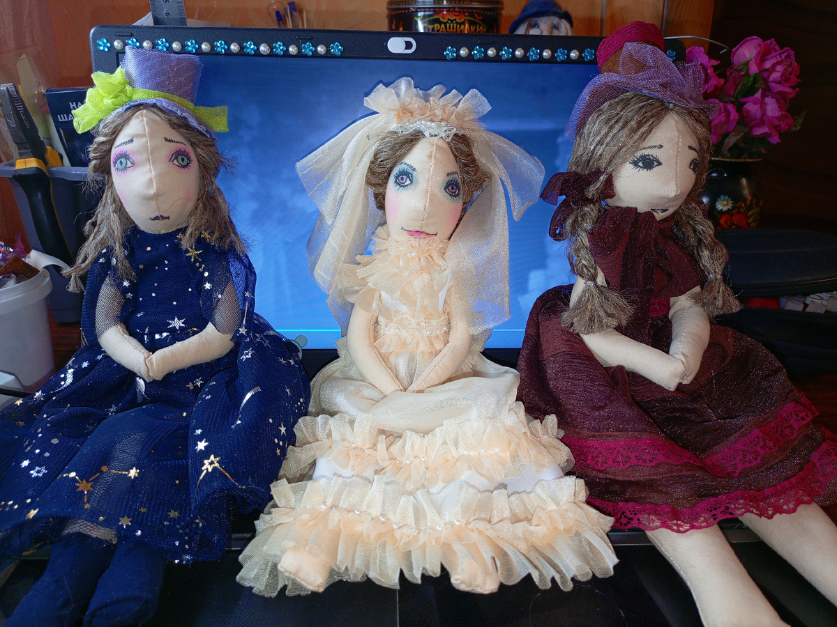 Добро пожаловать на мой канал! Наконец-то я села писать статью про своих новых кукол. телеграмм канал Кому интересно,вот видео про моих кукол. телеграмм канал Изначально я хотела сделать пару. Сами куклы сшились легко и быстро, но вот образ... Что-то я так долго думала над ним. А потом просто начала рисовать им мордашки. Первая кукла вышла с весьма наглым лицом, а вторая прям такая смущенная, даже печальная. И образы пришли сами собой. «НЕВЕСТА» Немного отступлю — я один раз зашла на распродажу и увидела там прекрасные шарфики всего по 29!!!! рублей. Я набрала их кучу. Они были из шифона. Я такая довольная была. Еще подумала: как мало мне надо для счастья, лишь бы красивых тряпочек побольше набрать. Для «Невесты» пошли в работу белый и нежно-бежевый шарфы. Для вдохновения в голове у меня был образ невесты из старого фильма про Дракулу. Я не собиралась делать что-то похожее, просто перед глазами мысленно стоял тот образ. Я помню, под каким впечатлением от него я была после просмотра.