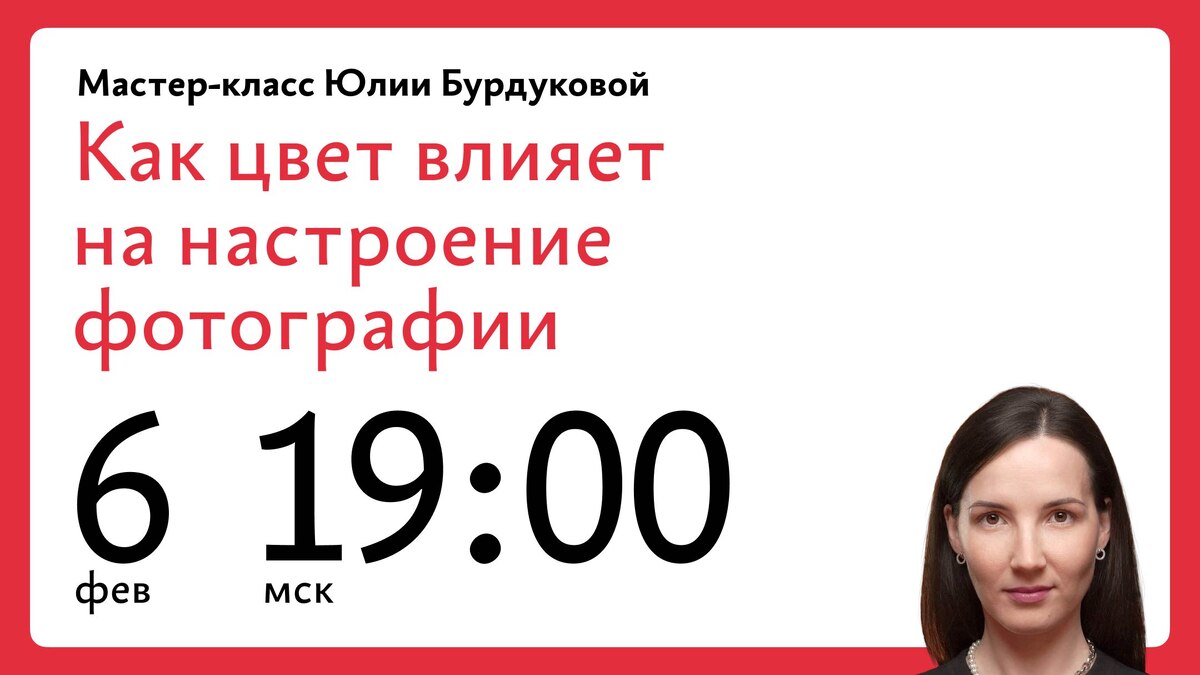 Хотим напомнить, что в четверг 6 февраля в 19:00 мск Юлия Бурдукова проведёт бесплатный мастер‑класс о роли цвета в ретуши. Юлия — автор курса «Ретушь лиц и портретов для изданий, соцсетей, рекламы и видеоблогов». Юлия объяснит роль цвета в ретуши фотографий, покажет примеры с разной цветовой гаммой и на одном из примеров лекции покажет, как разные цвета меняют настроение фотографии. Мастер‑класс будет полезен всем, кто ретуширует фотографии для себя и по работе: пользователям соцсетей, блогерам, начинающим фотографам, дизайнерам и ретушёрам, редакторам изданий, сммщикам, контет‑менеджерам и продюсерам видеороликов, онлайн‑курсов, эвентов и конференций. Записаться на мастер‑класс
