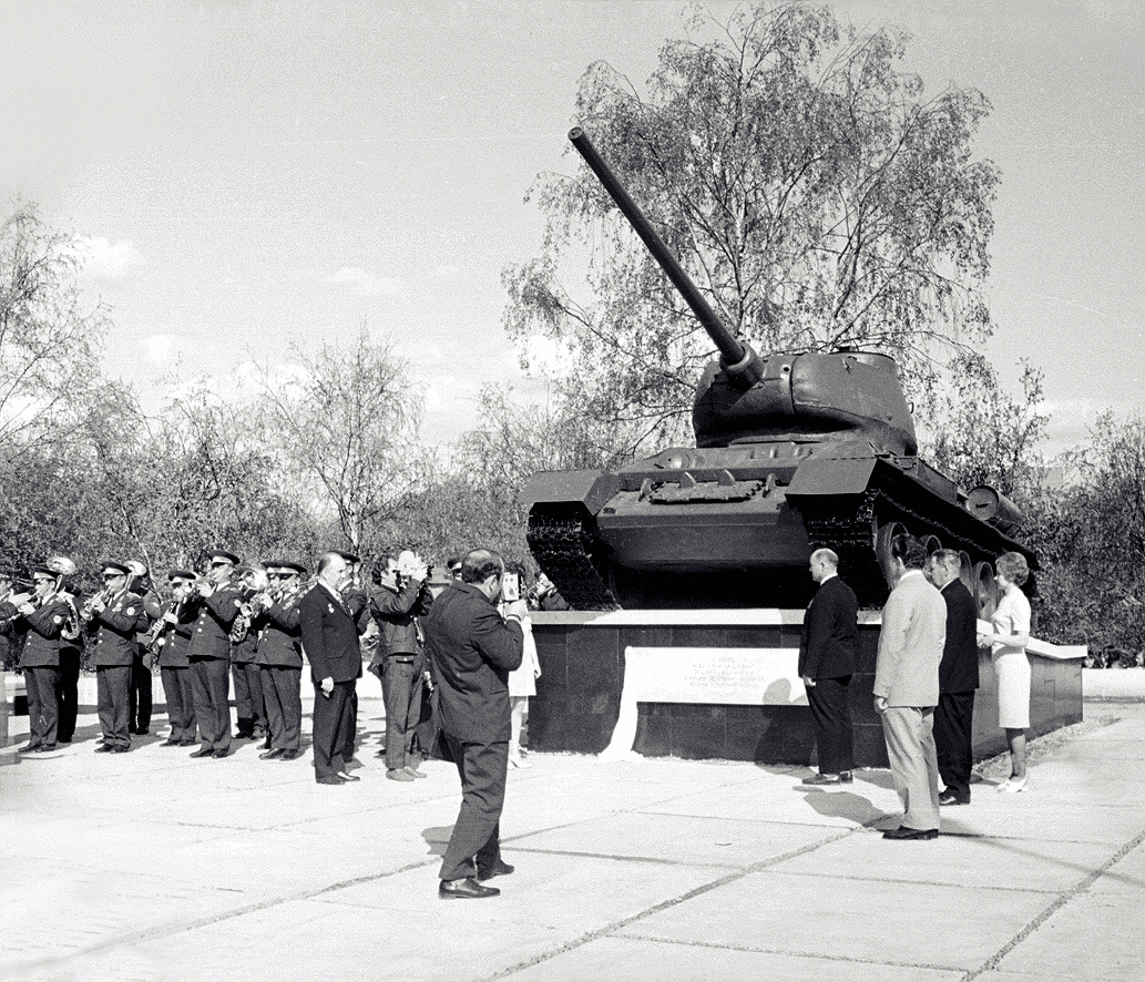 Торжественное открытие памятника на улице Мира, 8 мая 1975 года. Митинг в 15 часов открыл своим выступлением председатель исполкома городского Совета Владимир Дмитриевич Парменов. На снимке он стоит первым справа от оркестра. Потом выступили ещё несколько человек, а затем алую ленту разрезали почётный железнодорожник и Герой Социалистического Труда Борис Дмитриевич Валяев, полный кавалер ордена Славы Виталий Алексеевич Маслухин и швея-мотористка Светлана Романова. После этого пионеры возложили к памятнику цветы. Танк Т-34 1944 года выпуска был доставлен с территории Белорусского военного округа по железной дороге. А вот на постамент, что интересно, он взошел своим ходом.