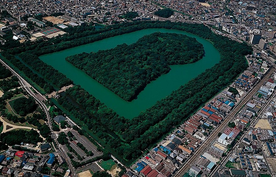 Курганы эпохи Кофун (III-VI вв.), в которых хоронили правителей и высшую аристократию древней страны Ямато, представляли собой гигантские могильные холмы в форме замочной скважины, окружённые несколькими рвами с водой. В соответствии с религиозными представлениями японцев того времени, после смерти человек отправлялся в иной мир со своей свитой и разнообразными вещами. Глиняная погребальная скульптура, получившая название ханива, может изображать воинов, музыкантов, домашних животных, суда для морских плаваний, предметы обихода, а иногда – целые дома. Ханива V века изображает постройку с несколькими входами, каждый из которых оформлен крытым крыльцом: на всех крышах далеко выступающий конёк оформлен характерной высокой наклонной аркой. На другой ханива (см. фото ниже) изображён дом более простой конструкции – на этой скульптуре хорошо видны перекрещенные стропила, завершающие скат крыши с двух сторон, а также стяжки между двумя прогонами конька. Крыша в японских традиционных постройках
