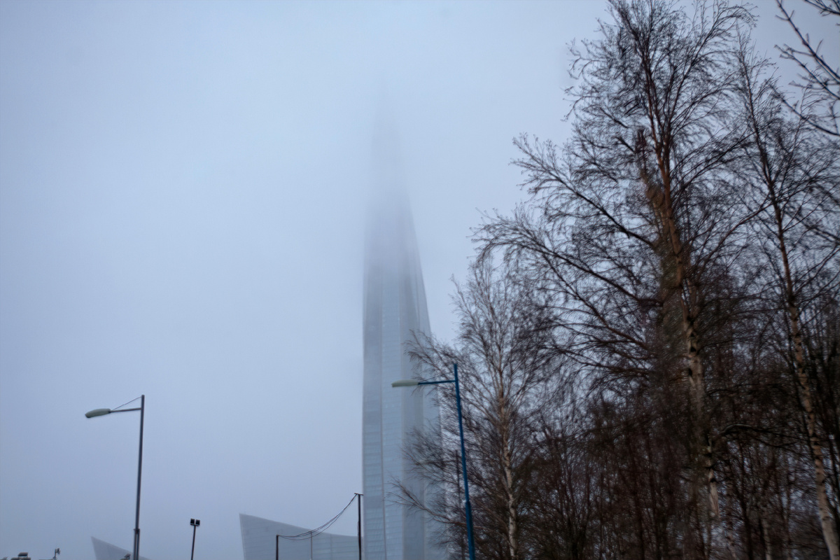 Одним не слишком погожим днём я отправилась посмотреть на самый высокий небоскрёб в Европе снаружи и изнутри. А если уж решила, то никакая метель не остановит - наш бронепоезд не свернуть, ослиное упрямство не выключить. Из парка 300-летия через метель небоскрёб почти не видно было, утешилась мыслью, что вот-вот подойду поближе и будет лучше. "Отнюдь' - сказала графиня, вокруг везде заборы. Не повторяйте мою ошибку, если соберётесь - через парк туда не пройти! С сожалением пришлось попрощаться с идеей дойти пешком. Вызвала такси. На будущее: ближе всего добираться от метро Беговая. Практически на любом автобусе проехать 2 остановки в сторону Лахты. И вот он - наш, пока единственный красавец - небоскрёб. Зато самый высокий в Европе, чем мы неимоверно гордимся. Строили его долго и дорого, причём собирались сначала эту красоту воткнуть на Охте, у Большеохтинского моста, напротив Смольного собора. Представляете картинку? Градозащитники представили, дружно взвыли и стеной встали на защит
