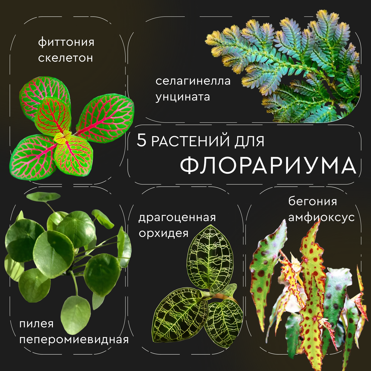 Флорариумы – это не просто декоративный элемент интерьера, а целый микромир, который позволяет создать уютный уголок природы прямо у вас дома. Для успешного выращивания растений во флорариуме важно выбирать компактные, неприхотливые виды, которым комфортно во влажной среде. Мы подготовили для вас пять растений, которые идеально подойдут для такого формата. 1. Бегония Амфиоксус Этот необычный вид бегонии сразу привлекает внимание своими продолговатыми листьями с красными пигментными пятнами. Бегония амфиоксус обладает рядом преимуществ: Благодаря своей декоративности и способности адаптироваться к условиям флорариума, эта бегония станет настоящей изюминкой вашей композиции. 2. Пилея Пеперомиевидная Пилея пеперомиевидная – ещё один отличный выбор для флорариума. Её круглые, глянцевые листья создают эффект плотного зелёного ковра, который оживляет композицию. Особенности этого растения: Пилея добавит флорариуму мягкости и свежести, гармонично сочетаясь с другими растениями. 3. Фиттони