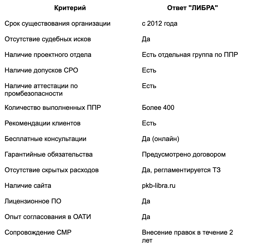 Разработка Проекта производства работ (ППР) – важный этап строительного процесса, от которого зависит безопасность, сроки и успешное завершение работ. Однако выбрать подрядчика для создания качественного ППР – непростая задача. На рынке много организаций, но не все способны выполнить документацию на высоком уровне и обеспечить её оперативное согласование. Следуя нашим рекомендациям, вы: Долговременная работа на рынке – признак надежности. Компания, работающая более 10 лет, имеет опыт согласований и знает, как учитывать требования всех инстанций. Например, проектно-конструкторское бюро "ЛИБРА" занимается разработкой ППР с 2012 года и обучило десятки специалистов. Проверить надежность подрядчика можно по открытым базам судебных решений. Наличие многократных исков – тревожный сигнал. Подрядчик должен не просто разрабатывать ППР, но и уметь адаптировать документацию под конкретные условия объекта. "ЛИБРА" имеет отдельную проектную группу, специализирующуюся на ППР, что позволяет учитывать