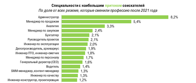 Рейтинг специализаций, которые люди чаще всего выбирали для перехода, возглавили администраторы — 8%.