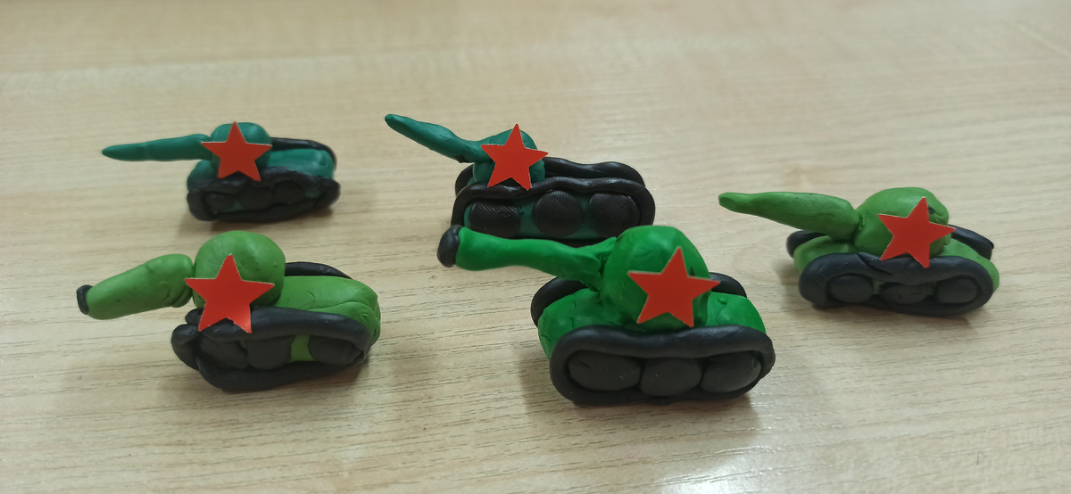 Мы с ребятами начинаем изготавливать поделки ко Дню защитника Отечества. Вчера лепили танки. Для их изготовления нам понадобилось: Этапы работы: 1. Из пластилина зелёного цвета скатали толстую колбаску. Пластилин нужно предварительно хорошо разогреть в руках. Если он слишком твёрдый, можно ненадолго положить на батарею (на доске). Чтобы пластилин не прилипал к рукам, можно перед началом лепки намазать руки кремом с глицерином. 2. Далее катаем шарик зелёного цвета, сплющиваем его снизу - это будет башня танка. Крепим на корпус. 3. Катаем небольшую колбаску зелёного цвета - пушку. Крепим на башню. 4. Теперь берём пластилин чёрного цвета и делаем колёса. Катаем шарики и сплющиваем их. Крепим снизу, по 3-4 с каждой стороны. 5. Для гусениц катаем длинную колбаску чёрного цвета. Оборачиваем её вокруг колёс. Лишнее обрезаем. 6. Осталось только прикрепить звезду. Для этого мы заранее с ребятами вырезали звезды с помощью фигурного дырокола из красной бумаги. 7. Танк готов! Скор