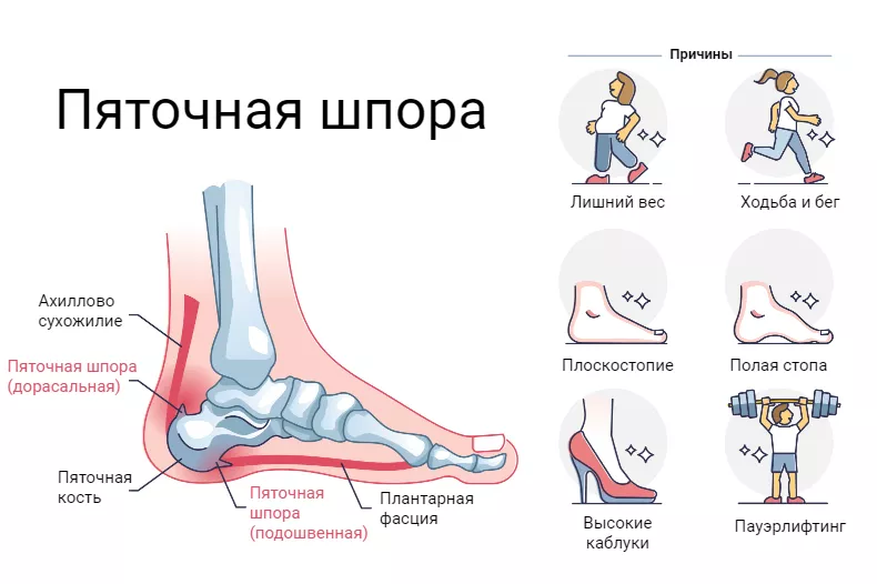 Принятое название «пяточная шпора», которое плотно осело в головах людей и врачей, не совсем корректное и не отражает сути, потому что «пяточной шпорой» рентгенологи обозначают «нарост» — экзостоз в области бугра пяточной кости, где как раз и крепится плантарная фасция. Загвоздка в том, что этот нарост не свидетельствует о наличии симптомов (о диагностике я расскажу более подробно чуть ниже), то есть его наличие или отсутствие не определяет заболевание. Более правильно данное заболевание называть плантарный фасциит/фасциоз или тенопатия подошвенной фасции — эти определения ближе к причине возникновения боли, дегенеративным (необратимым) изменениям в тканях подошвенной фасции.