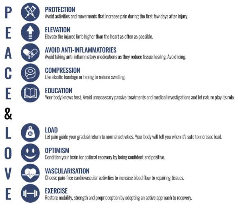 PEACE & LOVE – протокол лечения травм мягких тканей, включающий мероприятия, как на этапе неотложной помощи (момент травмы), так и в период восстановления. Протокол был разработан и внедрен в практику в 2020 году, и на текущий момент является повсеместно приятым, использующимся как в практике травматологом-ортопедов, так и врачей восстановительной и спортивной медицины. PEACE & LOVE является акронимом (аббревиатурой), каждая буква подразумевает определенный компонент в лечении. На мой взгляд данная аббревиатура легко запоминается и поэтому может использоваться в практике спортсмена-любителя. Давайте же разберем, что означает каждая буква. Для удобства понимания, из травмы предлагаю взять растяжение связочного аппарата голеностопного сустава, так как это достаточно частая травма получаемая не только при занятиях спортом, но и в повседневной жизни.