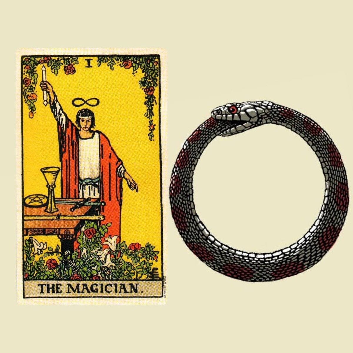 Я, когда в самом начале изучения Таро, очень внимательно рассматривала каждый символ на Аканах в колоде, и читала о них, не замечала на Аркане Маг - Уробороса (змеи, кусающей свой хвост). А все из за плохо прорисованных карт - и этого важного символа там просто не видно. В книге "Символика под микроскопом", написано, что это змеиный пояс, который символизирует: "Сбрасывание старой кожи, постоянное обновление". Но "змеиный пояс" - это может быть и пояс из кожи, например). 🐍 Артур Эдвард Уэйт включил этот символ не просто так, он вдохновился герметическими и алхимическими традициями. Как мы знаем, Уэйт, был членом Ордена Золотой Зари и глубоко погруженным в мистицизм эзотериком. ✔️Источник и значение Уробороса у Уэйта В «Иллюстрированном ключе к Таро» (The Pictorial Key to the Tarot, 1910) Артур Уэйт описывает Мага как представителя действия и проявления воли, а также носителя знания о законах мироздания. Вот несколько значений Уробороса в интерпретации Уэйта: ♾️Цикличность и вечно