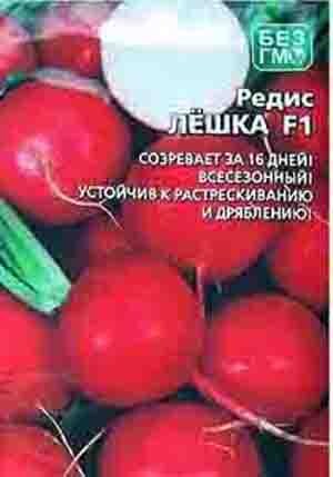 Это один из самых ультраскороспелых гибридов, который созревает на 16 день после появления всходов. Благодаря устойчивости к повышенной освещённости Лёшку F1 можно выращивать на протяжении всего сезона. Растения устойчивы к образованию цветоносов и высокоурожайны. Корнеплоды устойчивы к растрескиванию, не дрябнут, насыщенно-яркого красного цвета, с сочной, хрустящей, белоснежной мякотью. Вкус отличный. Для холодного летнего супа, приправленного густой деревенской сметаной, лучше не найти. Редис превосходно подойдёт для выращивания на раннюю пучковую продукцию.