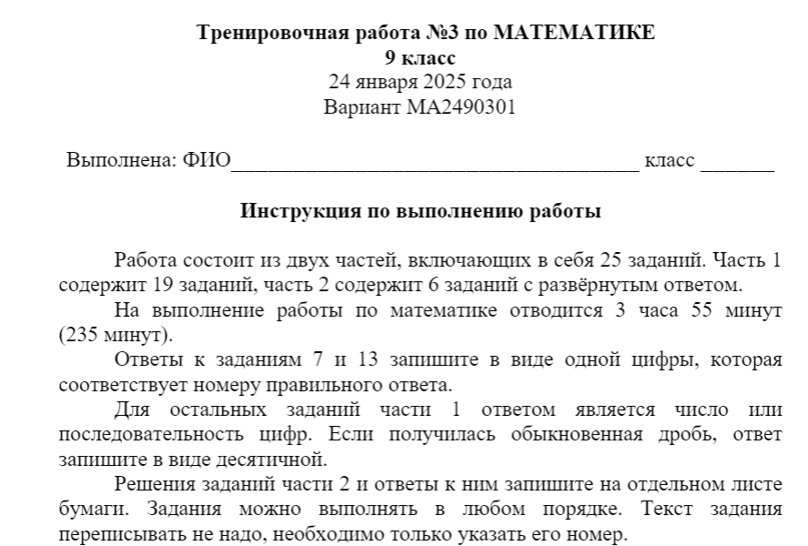Опубликована тренировочная работа №3 статград по математике 9 класс в формате ОГЭ 2025 года тренировочные варианты МА2490301, МА2490302, МА2490303, МА2490304 с ответами и решением для подготовки к государственному экзамену ФИПИ дата проведения пробника 24 января 2025.