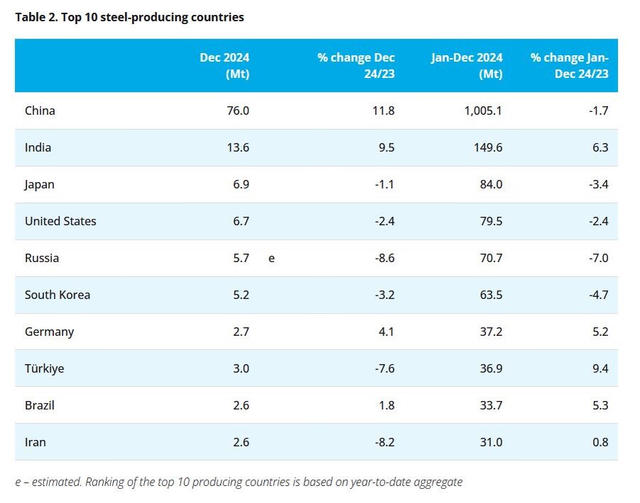 Мировое производство стали за 2024 год сократилось на 0,9%. Почти весь этот провал — по вине Китай (-1,7%). Но он все же выдал в декабре неожиданный рост производства и по итогам года вновь достиг более 1 млрд.тонн (55% мирового производства). Вероятно, это последний миллиард Китая, больше он таких объемов не достигнет. Впереди — существенный спад, по нашим оценкам, от 20 до 50%, связанный с замедлением экономического роста, кризисом в сфере жилищного строительства и завершением многих крупных инфраструктурных проектов (типа высокоскоростных магистралей). Стране больше не нужен миллиард тонн стали ежегодно, сокращение ее выплавки приведет к сильному обвалу китайского ВВП. Мы не раз писали об этом — здесь и здесь. Остальной мир в 2024 году сработал «в ноль». Где-то рост (Индия, Турция, Бразилия), где-то спад. В лидерах снижения — Россия (-7%). Это удивительно, учитывая крен нашей экономики в сторону военного производства, которое требует много металла... Похоже, что даже в военном произ