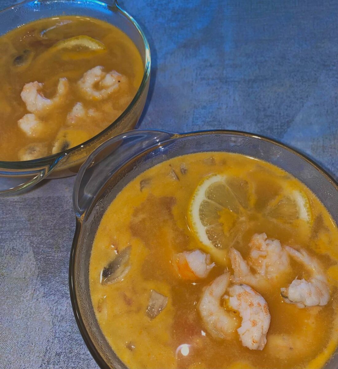 Ингредиенты: • 500 г креветок (очищенных) • 1 л куриного бульона или воды • 2 стебля лимонной травы • 3-4 листа кафир-лайма • 3-4 ломтика галангала (или имбиря) • 2-3 перца чили (по вкусу) • 200 г грибов (шампиньонов или других по желанию) • 2-3 ст. л. рыбного соуса • 1-2 ст. л. сока лайма • 1 ч. л. сахара • Кинза для украшения • Перец черный молотый (по вкусу) Приготовление: 1.В кастрюле доведите до кипения куриный бульон или воду. Добавьте в кипящую жидкость нарезанные на крупные куски стебли лимонной травы, листья кафир-лайма и галангал. Варите на среднем огне около 5-10 минут, чтобы ароматы раскрылись. 2.Добавьте нарезанные грибы в бульон и варите еще 5 минут. 3.Убавьте огонь и добавьте очищенные креветки. Готовьте до тех пор, пока они не станут розовыми и непрозрачными (около 3-5 минут). 4.Влейте рыбный соус, добавьте сок лайма и сахар. Попробуйте суп и при необходимости отрегулируйте вкус, добавив больше рыбного соуса или сока лайма. 5.Уберите с огня и добавь