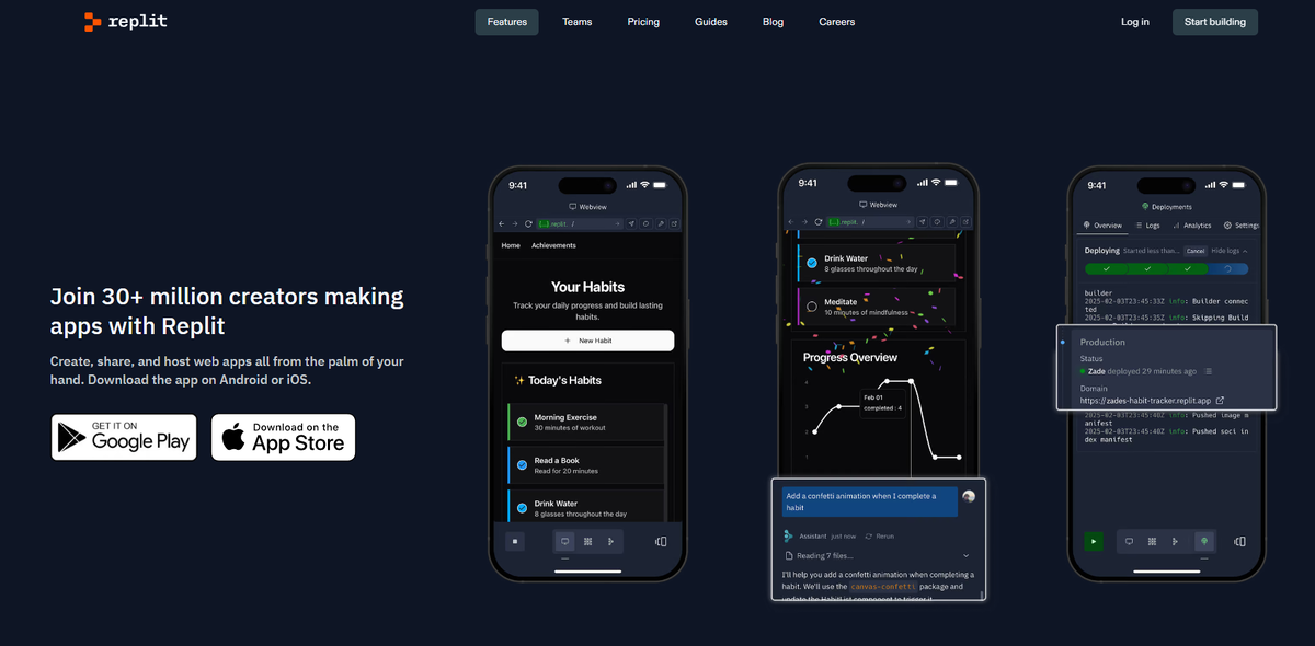 Replit — это онлайн-платформа для разработки программного обеспечения, которая включает в себя инструмент под названием Replit Agent. Этот инструмент использует искусственный интеллект для упрощения процесса создания приложений, позволяя пользователям разрабатывать, тестировать и развертывать приложения непосредственно в браузере. Replit с Replit Agent представляет собой мощный инструмент для разработчиков, позволяющий быстро и эффективно создавать приложения. Благодаря своей интеграции с IDE, поддержке множества языков и возможности работы с естественным языком, он становится отличным выбором как для начинающих, так и для опытных программистов.