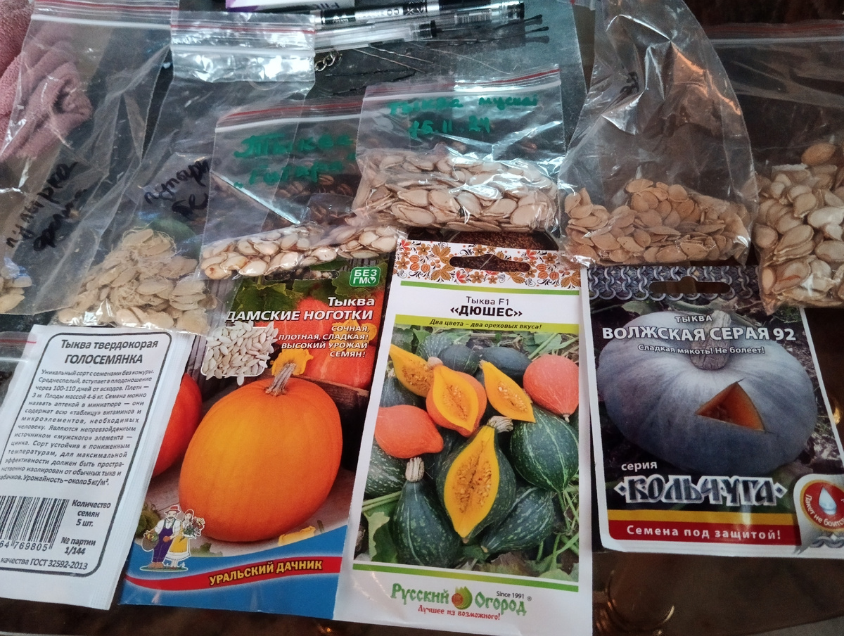 После перцев и томатов, число семян которых в сумме приблизились к тысяче и табака, который вообще не сосчитать, наши запасы семян всего, упомянутого в заголовке, выглядят, мягко сказать, скромно. Тыква только приближается количеством, но не разнообразием сортов. Посмотрим: В пакетах - "Гитара", " Мускатная круглая", "Стопудовочка" и ещё несколько анонимов из разных источников. И ещё декоративные: Тыкв мы планируем сажать много. На участке сына - очень много. Пусть давит траву. Зачем нам много тыкв? В-первых, это красиво и полезно! Во-вторых, в тыкве вкусные семечки. В-третьих, можно сделать много-много цукатов, штруделей, каш, запеканок и тыквенных супов. В-четвёртых, всё лишние тыквы можно отдать в благотворительную столовую. Кабачки и патиссоны. Тут поскромнее. Второй пакет "Солнышка" в подарок достался. Если встречу "Грошик" - до куплю. Нужно вырастить патиссоны, пригодные для консервирования, дети их очень любят. Кабачков обычных вообще не брала, только цукини ж