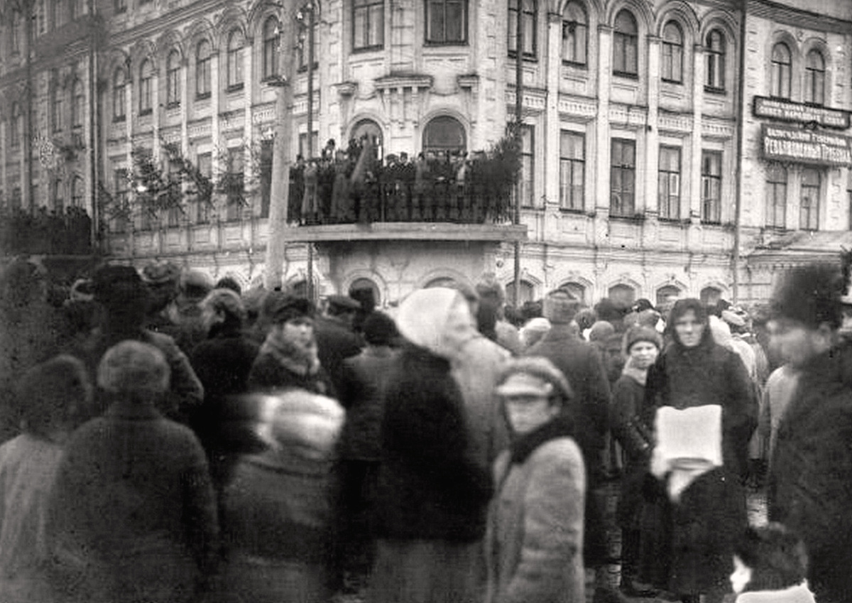 Митинг в начале 1920-х годов у перекрёстка Советского проспекта и улицы Володарского. Балкон бывшей гостиницы «Золотой якорь» забит до отказа. Участок современной улицы Пушкинской от площади Революции до современной улицы Марии Ульяновой с 1918 по 1951 года назывался улицей Володарского.