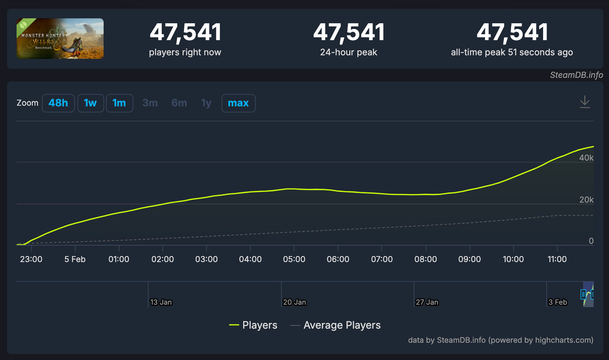 Бенчмарк Monster Hunter Wilds уже привлек почти 50 тысяч одновременных пользователей