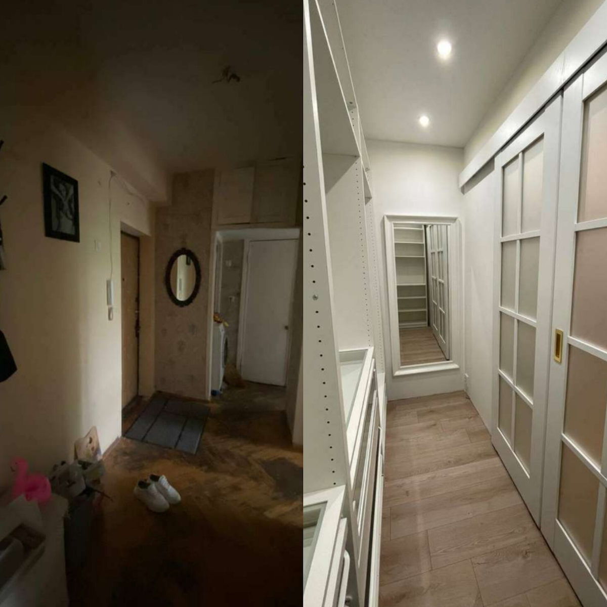 - Перепланировка. Самым важным этапом было разделение комнаты. Теперь у меня есть отдельная спальня и удобная гардеробная. Вместо беспорядочных шкафов и комодов — система хранения, где всё на своих местах.