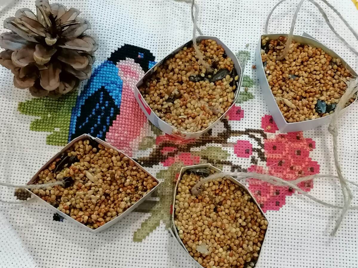 Важно не только мастерить кормушки, но и не забывать насыпать корм. Кормить птиц нужно правильно. Для этого подойдут семена подсолнечника, свежее или варёное сало, но не солёное крошки пшеничного хлеба. Чёрный ржаной хлеб, гречневую, гороховую, овсяную и перловую крупы- птицам нельзя.