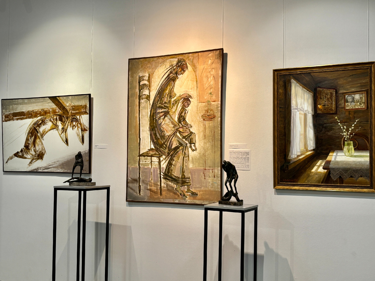 Вот картина «Предчувствие. Начало пути» – мать скорбно гладит сына по голове, а за ними – икона Богородицы. Продолжение истории кроется в следующем полотне под названием «Путь» – под тяжестью креста сгибается фигура Иисуса в терновом венке. На картине «Светлый день (в ожидании чуда)» тепло горит лампадка, словно тянет вербой, деревянной хатой и надеждой. Завершается всё белоснежно-лазурным полотном «Распятие» – настолько невесомым и образным, что не сразу разглядишь за ослепительным светом всю боль и муку.