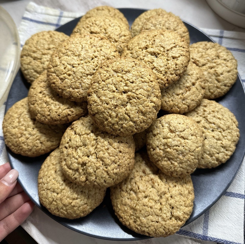 Овсяное печенье на овсяной муке или овсяных хлопьях. Самый удачный и лёгкий рецепт. Печенье как в детстве, собственно говоря, разбазариваю семейный рецепт от бабушки 🤭 Ароматное, нежное и просто самое самое🫶🏼Попробуйте хоть раз печенье именно по этому рецепту, и другое вам больше не захочется! В изначальном рецепте используется и овсяная мука, и овсяные хлопья, но можно заменить полностью на овсяные хлопья, измельчив их в блендере. Готовится быстро, получается бесподобно😋 Сухих ингредиентов (муки и хлопьев) должно быть 350г. Можно брать 150г муки и 200г хлопьев или наоборот, можно как хочется или удобно, я обычно беру 50:50, главное, чтобы овсяной основы было 350г⚖️ Овсяные хлопья 180г(или сколько взяли вы) измельчаем в блендере и соединяем все сухие ингредиенты. В миску высыпаем измельченные хлопья, 170г овсяной муки, 150г сахара, половину чайной ложки соды и щепотку соли. Добавляем одно яйцо, 100г растопленного сливочного масла со столовой ложкой мёда и три столовые ложки смет