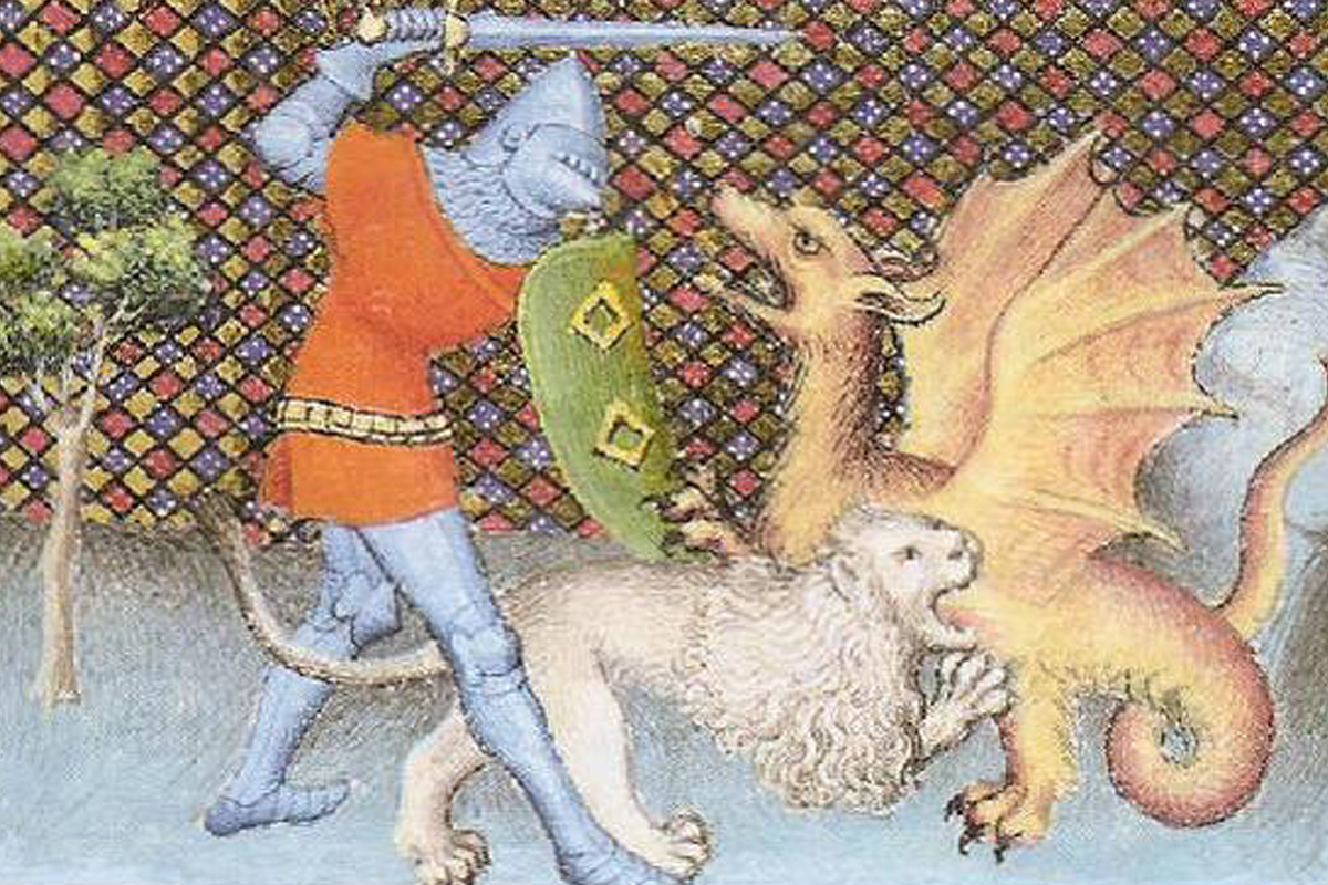 Сцены 4 (Ивейн у волшебного колодца) и 5 (Битва Ивейна с Аскалоном) росписей, на самом деле кажущиеся 1, а не 5!
