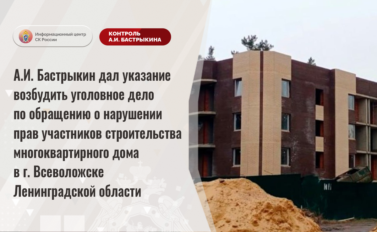 А.И. Бастрыкин дал указание возбудить уголовное дело по обращению о нарушении прав участников строительства многоквартирного дома в г. Всеволожске Ленинградской области В Информационный центр СК России поступило обращение по вопросу продолжающегося нарушения участников паевого строительства ЖСК «Всеволожский штиль» в городе Всеволожске Ленинградской области. С 2014 года граждане заключали с ООО ПМК «Всеволожскиндстрой» договоры на приобретение квартир в строящихся домах. Однако застройщиком взятые на себя обязательства исполнены не в полном объеме: в 2019 году несколько корпусов введены в эксплуатацию, а строительство оставшихся зданий до настоящего времени не завершено. Многочисленные обращения обманутых пайщиков результатов не принесли, содействие в восстановлении нарушенных прав им не оказано. Указанная ситуация освещалась в СМИ. А.И. Бастрыкин поручал представить по ней доклад. В СУ СК России по Ленинградской области проводится процессуальная проверка. Председатель Следственного к