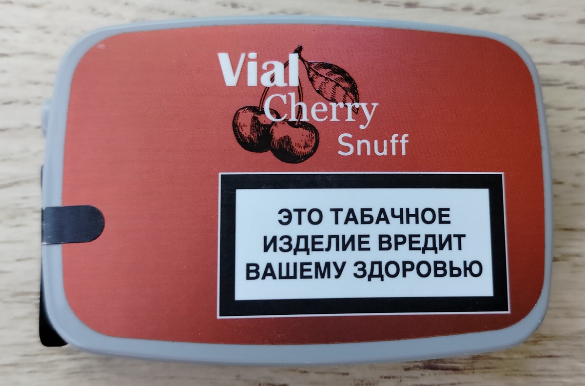 Сегодня пробуем снова российскую новинку от бренда Vial. Тульский табачный завод. Vial не производит, а отдаёт производство на сторону со своей формулой. Снова заказан на онлайн площадке, так как в сетевых магазинах его ещё нет, что плохо. Стоимость 365р. цена средняя. Упаковка удобно лежит в руке. В кармане не просыпается. Состав написан сзади. Стандартные 9 грамм. Очень приятный аромат вишни. Упаковка с пластмассовой удобной откидной крышечкой и держателем для более удобного дозирования. Открываем. Насыпаем Снова комочки. В полевых условиях на ходу не удобно пользоваться таким табаком. Сильный запах малины, ментола совсем мало. Употребляется такой табак либо с руки (нужно насыпать на тыльную сторону дозу примерно с горошину), либо с помощью трубочки. Я использую из под гелевой ручки - она широкая и табак не застревает. С первым разом ничего не ощущается, так как крепость слабая 2/5, максимум 3/5. Продукции Vial для эффекта надо достаточно большое количество высыпать и повторить не