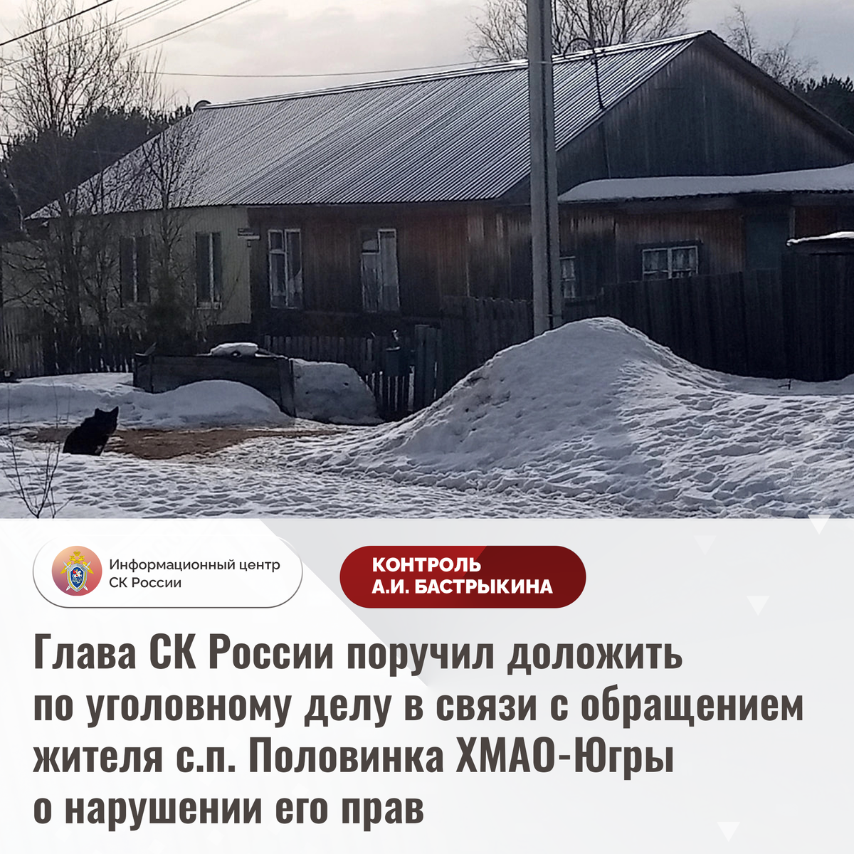 Глава СК России поручил доложить по уголовному делу в связи с обращением жителя с.п. Половинка Ханты-Мансийского автономного округа — Югры о нарушении его прав В адрес Председателя СК России А.И. Бастрыкина через его приёмную «ВКонтакте» поступило обращение ветерана боевых действий из Ханты-Мансийского автономного округа - Югры по вопросу нарушения его жилищных прав. Мужчина по договору социального найма проживает в четырехквартирном доме на улице Пионерской сельского поселения Половинка. Капитальный ремонт здания, 2001 года постройки, никогда не проводился. В настоящее время строение находится в ветхом состоянии: его фундамент разрушается, конструкции деформировались, стены промерзают, в них образовались трещины, тепло- и водоснабжение отсутствуют. Однако дом аварийным не признан. Многочисленные обращения в компетентные органы результатов не принесли. В СУ СК России по Ханты-Мансийскому автономному округу – Югре по данному факту расследовалось уголовное дело, которое прекращено. Пред