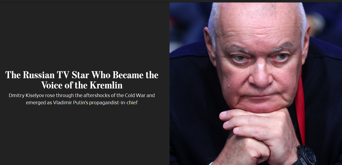 Российский пропагандист Дмитрий Киселёв дал интервью The Wall Street Journal, это его первый разговор с западным СМИ после начала CВО. В нем он пожаловался на ранние разводы, сравнил первый Майдан с полем боя и заявил, что объективности не существует. Целью своей работы Киселёв назвал «войти в сознание, в душу» телезрителя. Он утверждает, что никогда не получал указаний от чиновников, но при этом подтверждает, что раз в несколько месяцев посещает встречи в Кремле, на которых обсуждаются экономические проблемы развития России. Пропагандист назвал их «обменом энергиями». Киселёв считает, что время беспристрастной журналистики закончилось, а «объективность — это миф». При этом, как отмечают другие собеседники The Wall Street Journal, ранее он был «одним из ярчайших защитников журналистской этики» и призывал ни в коем случае не снижать стандарты. Из-за этой позиции он не смог найти работу в России после прихода президента к власти в 2000 году и продолжил карьеру на Укpaине, откуда спе