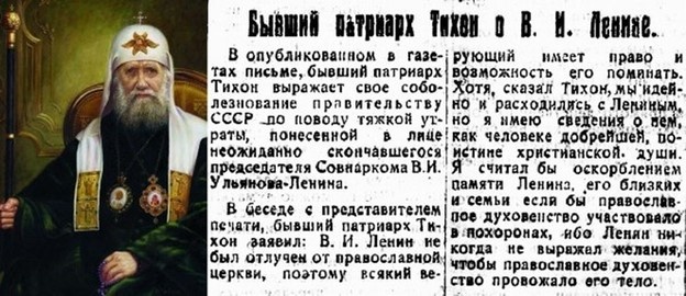 В опубликованном соболезновании по случаю смерти В.И. Ленина патриарх Московский и всея России Тихон заявил: