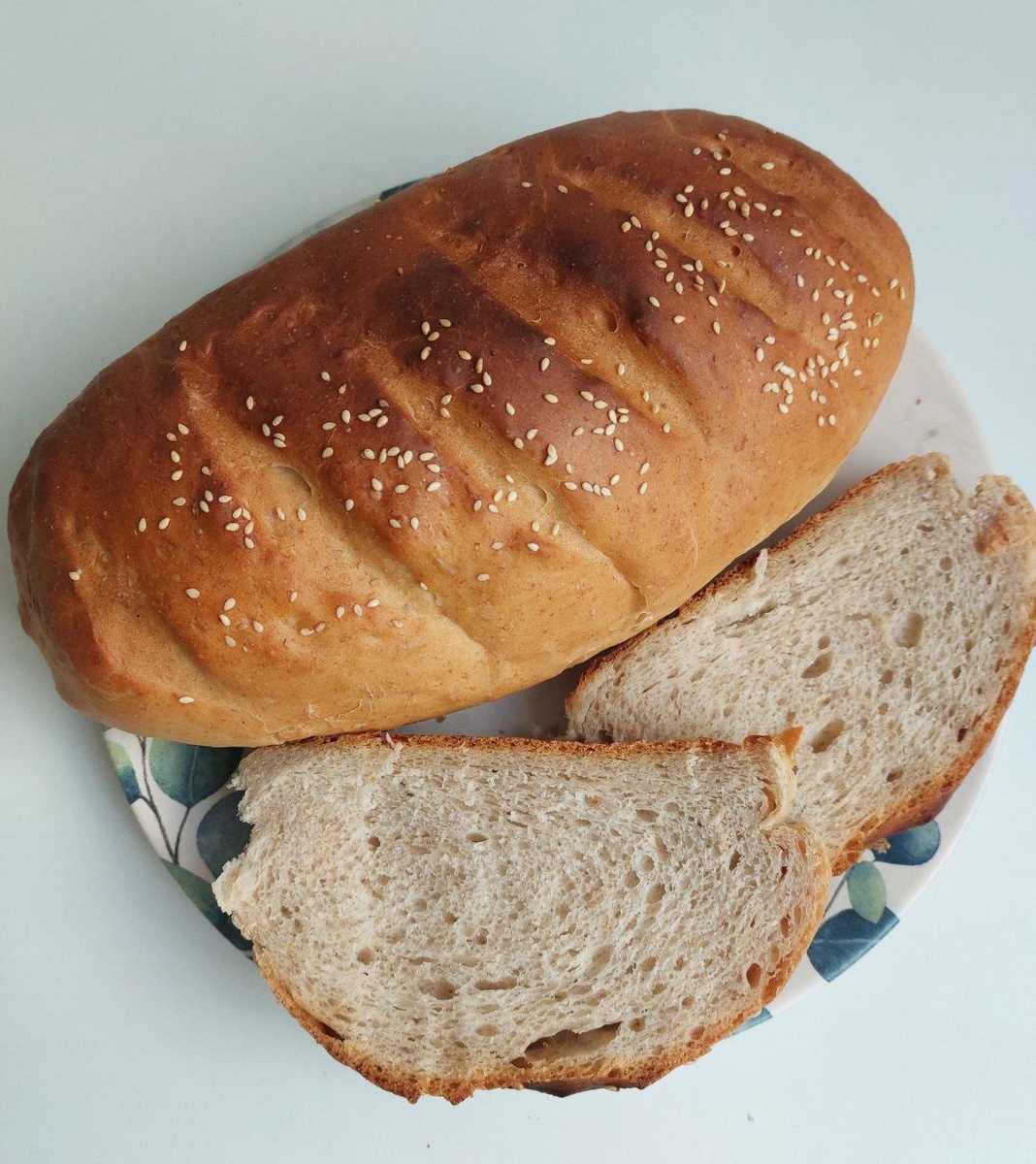 Уже пару месяцев пеку хлеб сама, чередуя хлеб на закваске и дрожжевой. Сегодня хочу поделиться своим любимым рецептом дрожжевого хлеба, он получается очень мягким и воздушным. Инридиенты: В тёплую воду добавить дрожжи, сахар, соль, размешать и оставить на 15 мин. Далее добавить подсолнечное масло, муку в 3 подхода (я беру 100 цельнозерновой и 600 обычной), замесить тесто. Далее тесто скатать в шар, смазать растительным маслом. Переложить в миску, накрыть полотенцем и оставить на пол часа. У меня будет 2 батона. Поэтому тесто разделить на 2 части. Взять одну часть, раскатать, свернуть в рулет и перекложить на противень. Со второй частью теста аналогично. Батоны смазать молоком, сделать надрезы, по желанию можно посыпать кунжутом. Выпекать в духовке при температуре 200 градусов 30-35 минут. Переложить хлеб на тарелку, накрыть полотенцем. Разрезать хлеб лучше немного остывшим. Приятного аппетита!