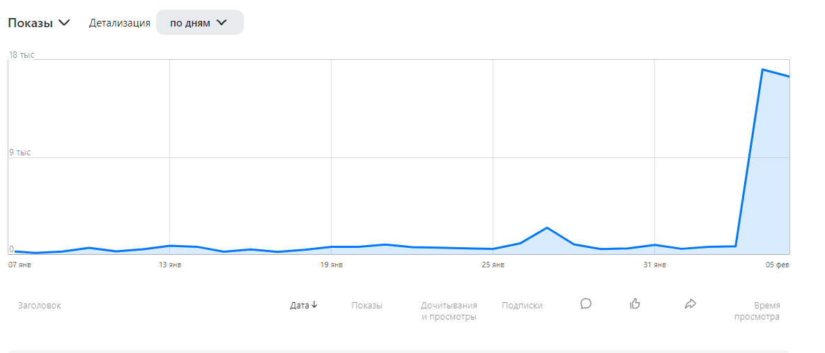 Вот вам очередное доказательство странных алгоритмов Дзена. Не знаю, надолго ли такие показы, со мной уже такое случалось, когда приходили хорошие просмотры, но через пару дней всё обрубалось.