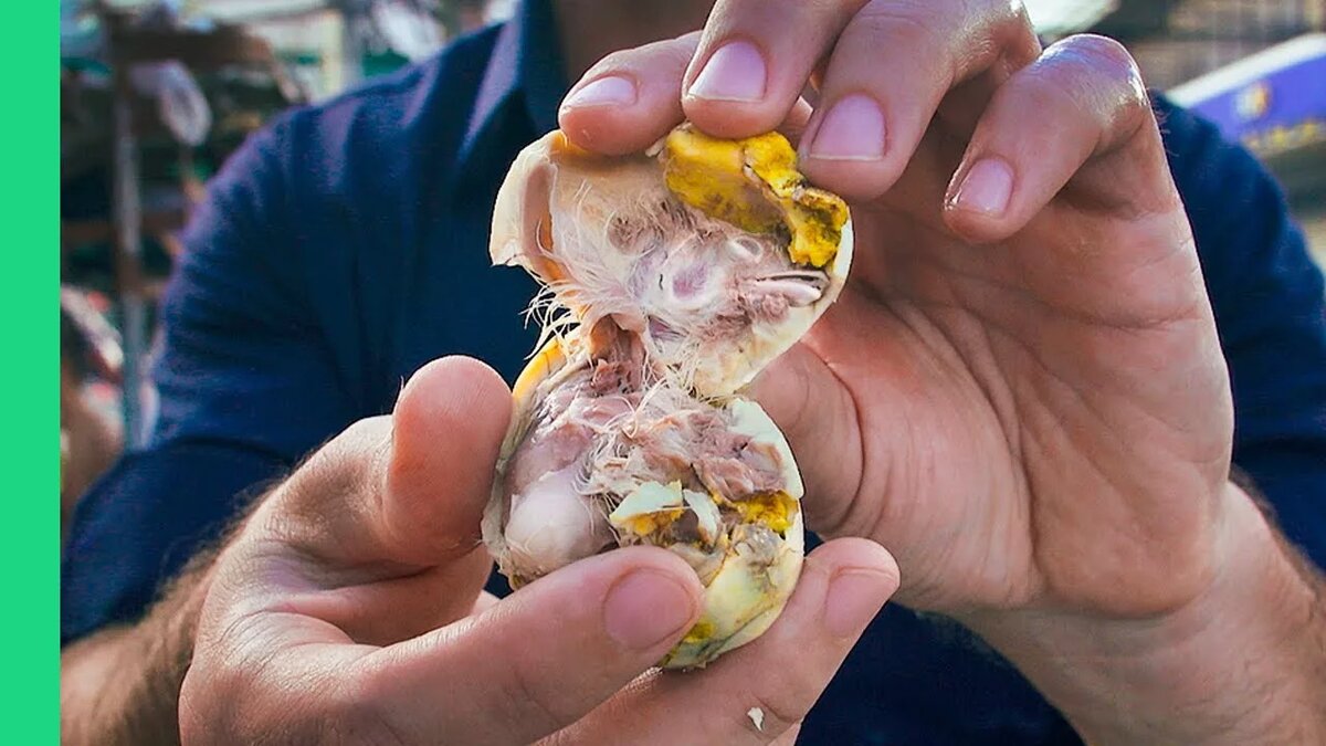 Это варёное утиное или куриное яйцо, внутри которого уже сформирован эмбрион с клювом, хрящами и перьями. Блюдо популярно в странах Юго-Восточной Азии и считается источником белка. Подаётся с солью, перцем и иногда уксусом. По отзывам, текстура сочетает хруст костей и нежность желтка, а вкус напоминает куриный бульон Рыба-шар, содержащая смертельный яд тетродотоксин. Приготовление требует лицензии: повара удаляют ядовитые органы, а тонко нарезанное мясо подают как сашими. Вкус описывают как нежный, с лёгким морским ароматом, но главная «изюминка» — адреналин от риска Ферментированное мясо ската с резким аммиачным запахом, который сравнивают с «ароматом» общественного туалета. Готовится путём длительного маринования, подаётся с кимчи. Несмотря на запах, блюдо считается деликатесом и даже лекарством от похмелья Пауков ловят в джунглях, обжаривают в масле с чесноком и солью. Хрустящие лапки сравнивают с чипсами, а брюшко — с нежным крабовым мясом. Популярны на рынках Пномпеня как дешё