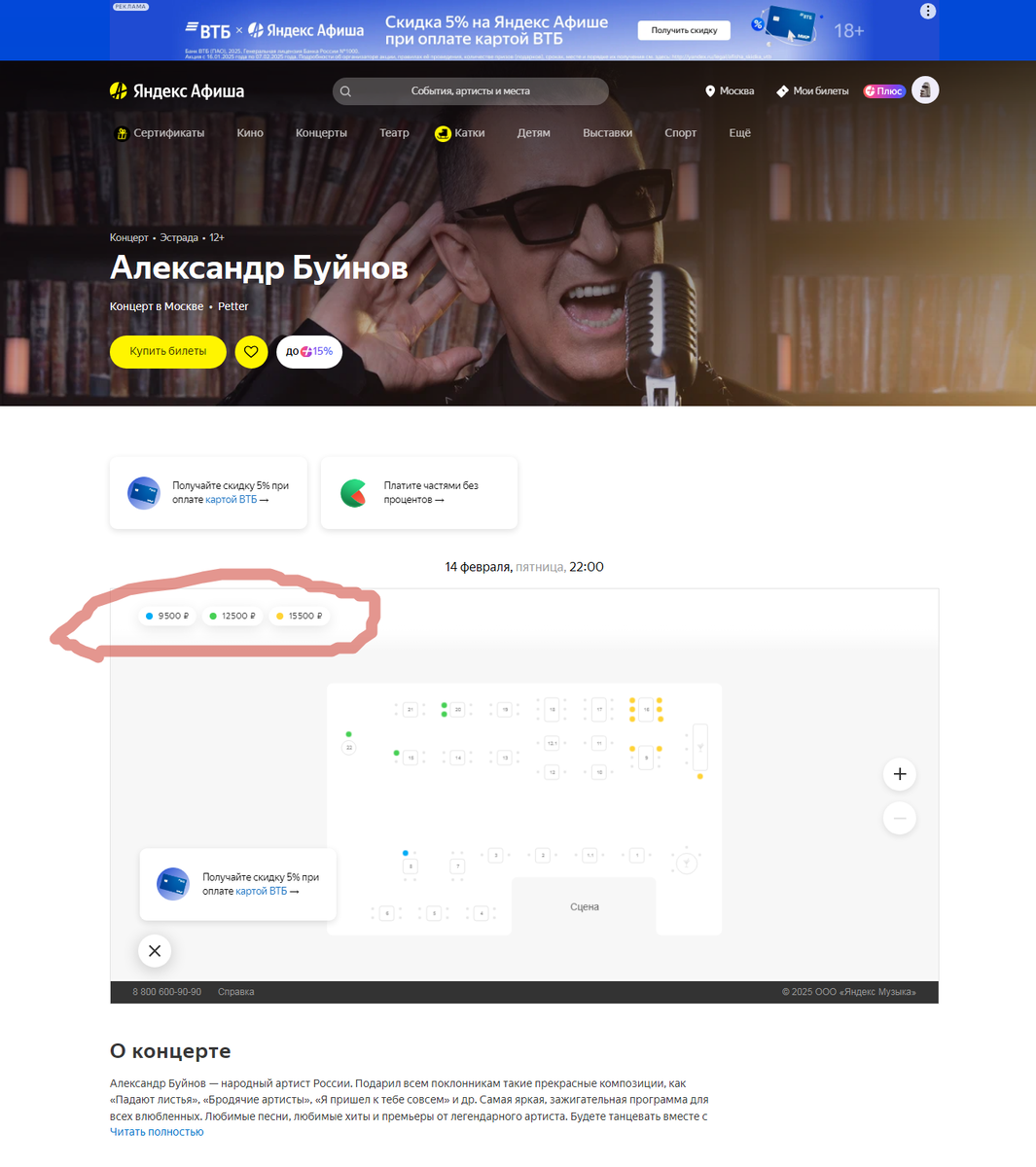 Не знаю, видно или нет на скрине (выделено красным), но стоимость билетов на его ближайший концерт от 9 500 до 15 500 рублей. Ну вряд ли он бедствует и не в состоянии оплатить собственное лечение.