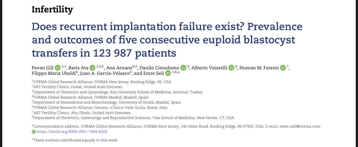 *Результаты 5 попыток переноса эмбрионов у 123 987 пациенток* 🔍 Главный вопрос Есть ли шансы на беременность после 4-го и 5-го переноса эмбрионов с нормальным набором хромосом, если первые 3 попытки не завершились успехом? 💡 Ключевые выводы - 4-я попытка: 40% успеха (рождение ребенка). - 5-я попытка: 53,3% успеха. - Общий шанс после 5 попыток: 98,1% (95% ДИ: 96,5–99,6%) 🎉 📌 Что уже известно - После 3 переносов эуплоидных эмбрионов шанс на успех — 92,6%. - Основная причина неудач — генетические аномалии эмбрионов. 🔬 Как проводилось исследование: - Участники: 123 987 женщин из 25 клиник (2012–2022 гг.). - Критерии: - Только эмбрионы с нормальным набором хромосом, исключены другие факторы возможных неудач - Минимум 4 попытки переноса. Методы: - Генетический скрининг эмбрионов (PGT-A). - Анализ данных из медкарт. 📊 Главные результаты - 4-й и 5-й переносы дали схожие результаты (40% vs 53,3%, p=0,14). - 98,1% женщин родили ребенка после