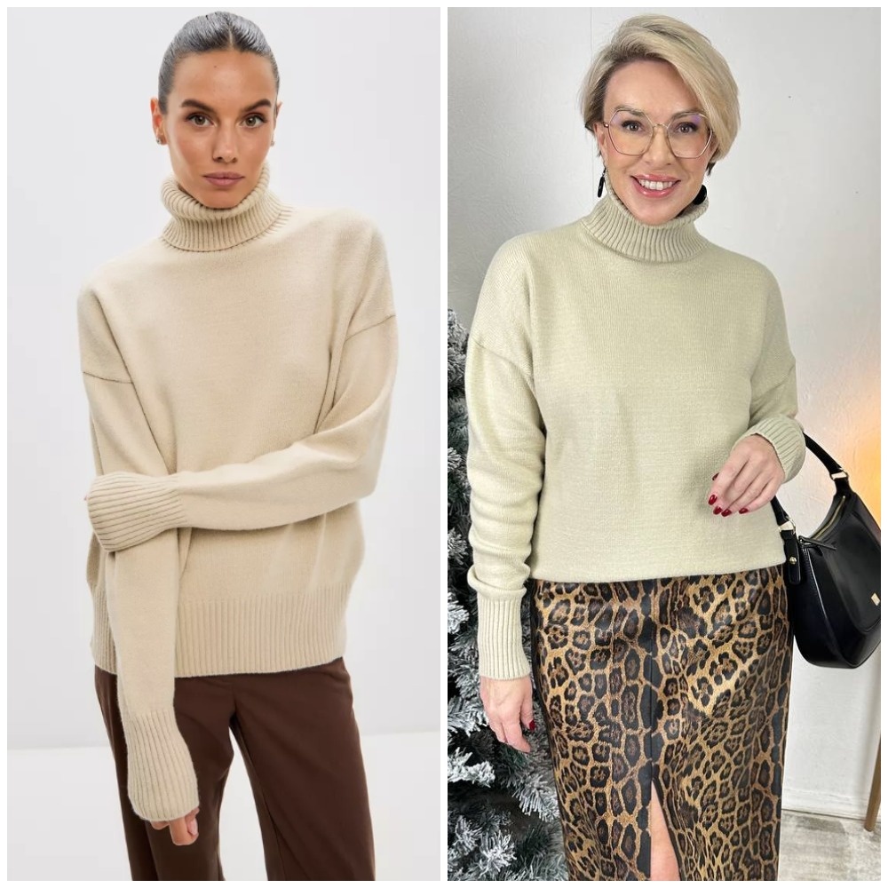 Базовый свитер с высоким горлом в спокойном бежевом цвете, который будет сочетаться абсолютно со всем (на видео ниже показала интересный, неизбитый образ с ним). Модель связана из очень приятной, мягкой ткани с хорошим составом. Такой свитер абсолютно вне времени.