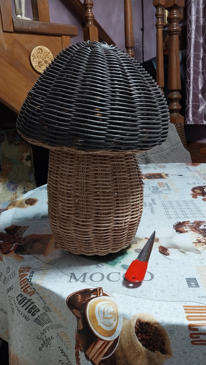 Сплела гриб-вазу из прутка 3 мм, производство "Пермь". Как это было: нарезала 16 лоз по 95 см.,для ножки- вазы.нашла серединку. Соединила их по 4 прутка как на фото,и оплела их рабочей лозой(взяла 13,5 м) Далее плела и стойки разъединяла по 2шт. как на фото(донышко) Плела веревочкой слева на право,левой рукой держишь,правой плетешь. Далее переворачиваем донышко и загибаем стойки в верх,плетем стенки. Так же плетем слева на право,до нужной высоты. У меня вышла ножка на 22 см . Кончики заправила через стойку. Тем самым усилились стойки ножки.Готово! Далее плетем шляпку. Нарезала лозы 16 шт по 90см. Рабочая лоза 13м (сгибаем пополам )+по 7 м (2шт)для нарашивания. Складываем квадратик по 4 шт. и оплетаем веревочкой рабочей лозой 4 ряда,далее разделяем по 2 стойки,и оплетаем по кругу веревочкой. Плетем до нужного размера шляпки. Лозы можно соединить феном или просто как на фото (потом паяльником скрепить тихонько ). Далее плетем подшляпник. Лозы загибаем во внутрь и плетем рабочей лозой то