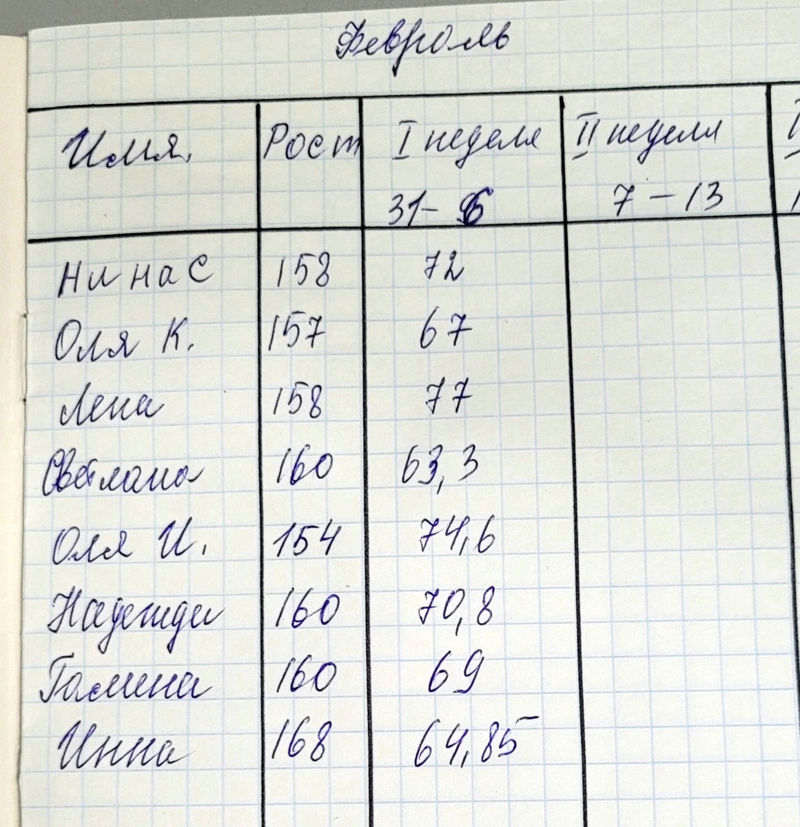 Дорогие девочки, составила я вот такую таблицу. Пыталась это сделать на компьютере, но не научилась. Частично данные введу,не туда нажму, они улетают. На бумаге мне проще. Каждую неделю будет виден результат. А в конце месяца подведение итогов. Сегодня только Инна показала свой вкусный, аппетитный завтрак. В следующий вторник все показывайте, что вы едите. В течении недели можно сфотографировать и во вторник показать. Нам всем будет очень интересно. А завтра мы рассказываем, какая физнагрузка у вас в течении недели. Вторник и четверг удобнее, чем среда и пятница. В пятницу у нас по весу отчет. Девочки, мы ж не только худеем. некоторые уже на удержании. Но мы так же стараемся правильно питаться и держать мышцы в тонусе. Сейчас я расскажу, какая физическая нагрузка у меня была на этой неделе. А упражнения пока никак не соберусь начать делать. Хотя сегодня на работе немного пыталась. Еще раз на своем примере хочу показать, как ходьба оздоравливает. Тьфу,тьфу,тьфу - у меня перестали б