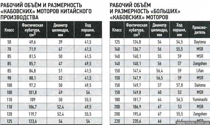 Ниже представлена таблица с кубатурностью кабоских моторов