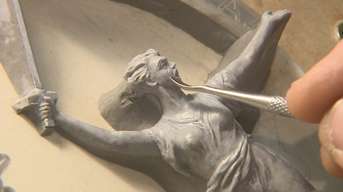 Сувенир с особым значением. Гости Сталинграда-Волгограда в дни майских торжеств смогут увезти с легендарной земли не только незабываемые эмоции и впечатления. Непростую задачу поставили перед собой сегодня волгоградские производители памятной продукции. Фото: Александр Шастин «Все линии должны сходиться, мне нужно вложить огромное количество метров в этот объем, то есть визуально представить, что это не ломает глаз», – объясняет мастер. Известный всему миру монумент, только в тысячу раз меньше. Инструмент у скульптора соответствующий. То, что выпускают на этой фабрике, вряд ли можно отнести к обычным сувенирам. На основе ограниченных размеров мастер располагает сразу несколько символов героического Сталинграда. «Я отсмотрел какое-то количество фотографий, выбрал для себя интересные, утвердили и начали работать», – рассказывает специалист. Немаловажная делать – игра света и теней. Так мастер определяет, что нужно подправить, насколько реалистичны изгибы рук. Сложнее всего повторить выра
