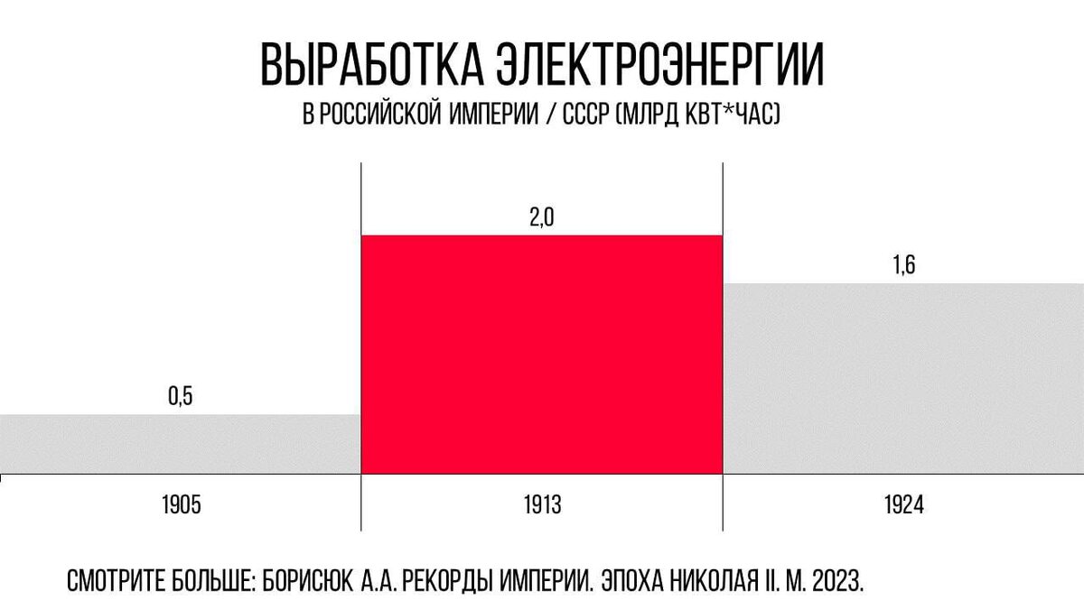 В 1924 году - в последнем году жизни «Ильича» объемы выработки электроэнергии в СССР составляли 1,6 млрд кВт*ч. (Согласно официальным советским данным). Много это, или мало? Всё познается в сравнении. В 1916 году в Российской Империи вырабатывалось по разным данным от 2,6 до 4,7 млрд кВт*ч электроэнергии. Более точные данные известны на 1913 год - 2 млрд кВт*ч. То есть показатели 1924 года - это падение, а не взлёт! Хорош «родоначальник»?