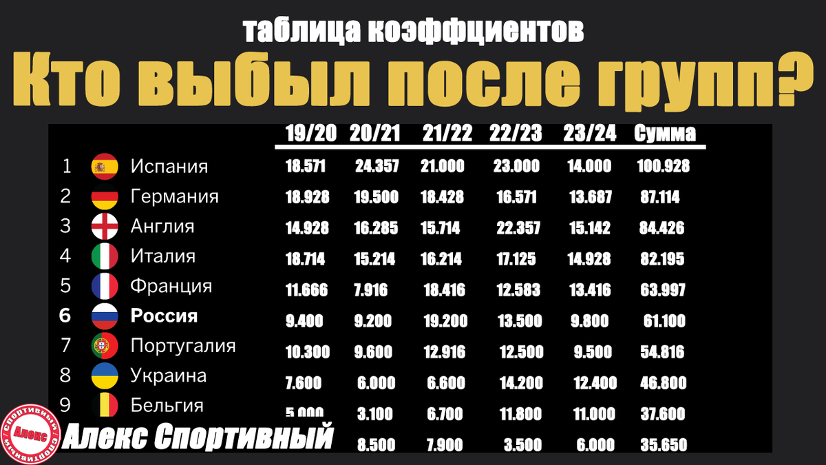 Здравствуйте. Обновилась таблица коэффициентов УЕФА после завершения основного этапа. Сразу несколько клубов потерял Израиль, Франция, Германия. Хотите узнать, какие две страны перед плей-офф сохранили всех участников? Перечислим страны, сохранившие участников перед плей-офф. Переходим к ТОП-5. Здесь остановимся подробнее. Франция. 5 место. 5/7 команд Германия. 4 место. 5/8 команд Я заметил вашу активность в рутубе и вконтакте. Спасибо, что подписываетесь. Спасибо, что поддерживаете. Услышимся на «спортивном».