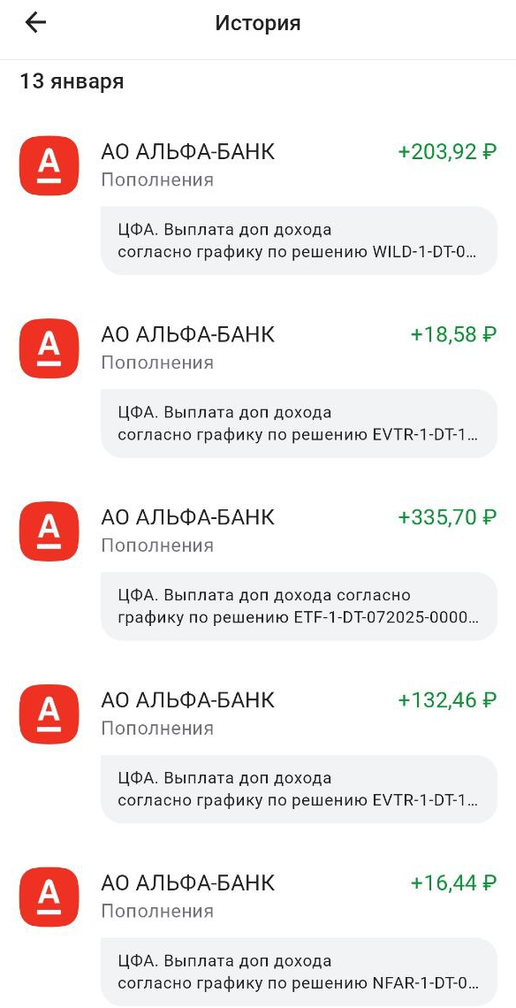 В ЦФА я инвестирую не так уж и много денег - доходы с Дзена, а сейчас даже не все. Мне удобно когда купоны капают прям на карту, иногда я их проедаю, а иногда реинвестирую, когда есть что добавить из вне. В январе мне поступила рекордная сумма выплат - 1122 рубля. Видимо, опять Альфа с половины купонов забыла НДФЛ удержать, но мне же лучше в данном случае.