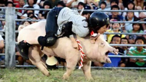 Родео на свиньях с мускулистыми парнями. Новый вид спорта в Японии набирающий популярность среди женского пола.