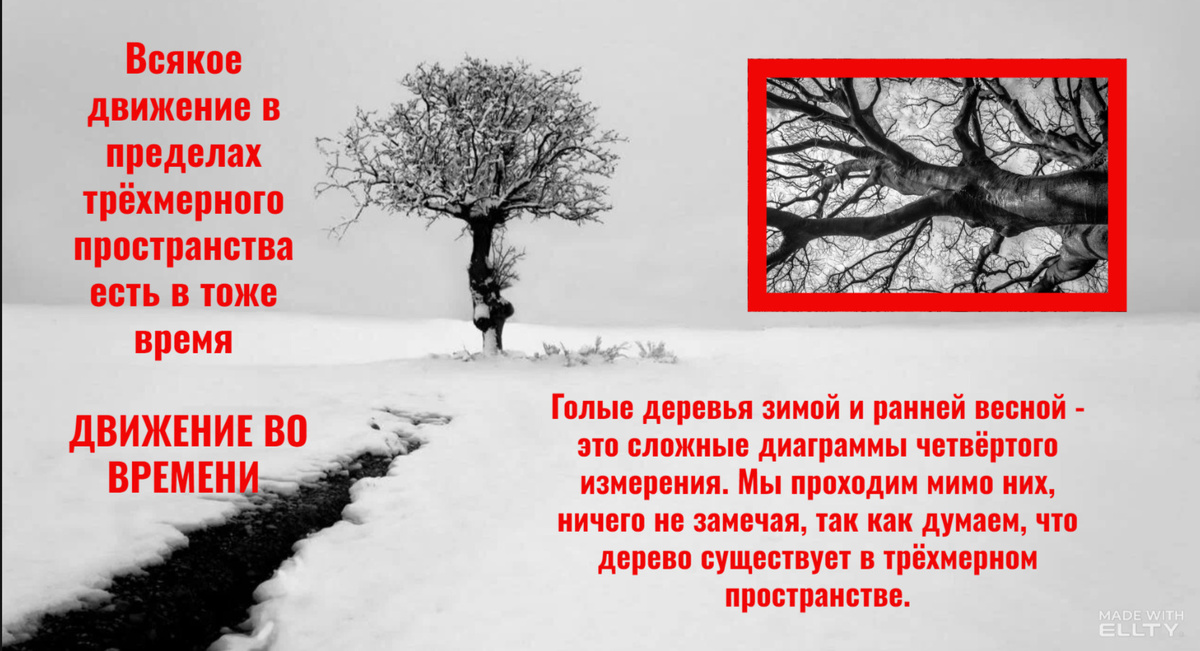 Для нас ДВИЖЕНИЕ начинается в четвёртом измерении и представляет собой частичное ощущение четвёртого измерения. Но движения четвёртого измерения для нас растворяются в движениях пятого и шестого.