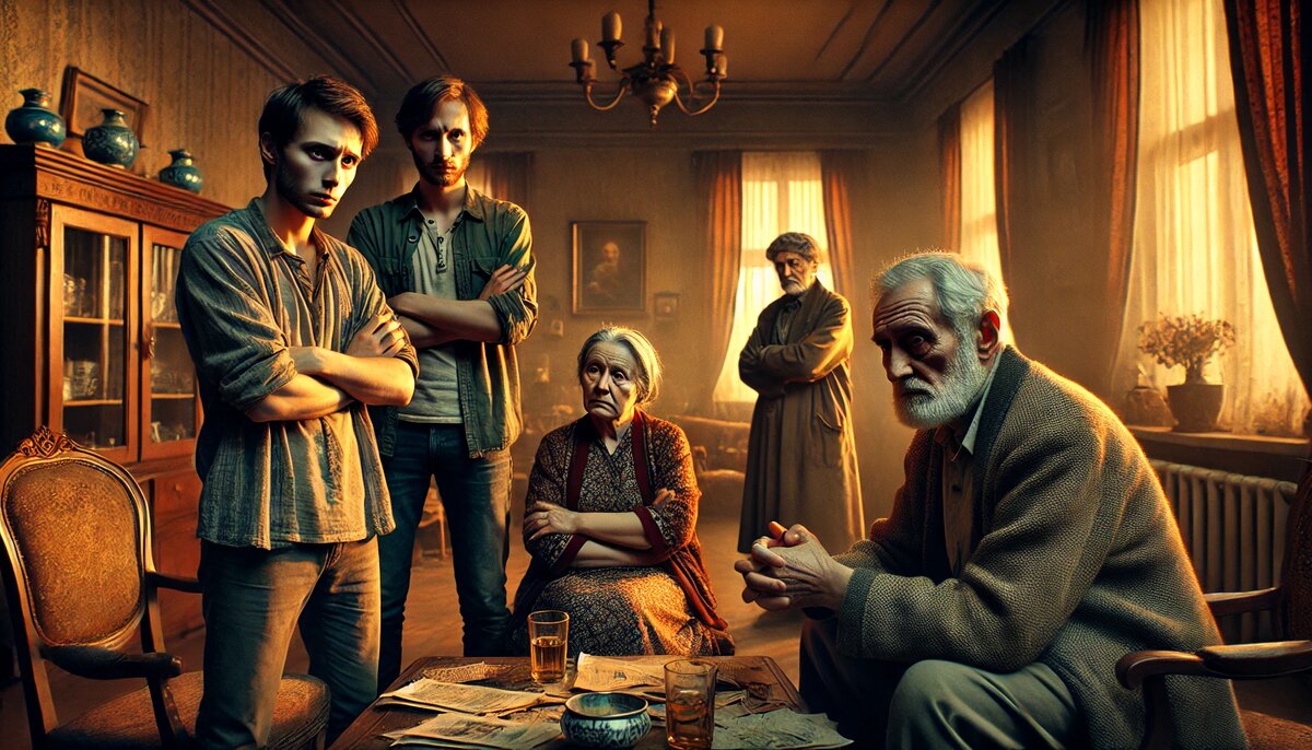 В просторной гостиной было тесно от напряжения. С потолка одиноко свисала хрупкая люстра: жёлтый свет подчеркивал усталые лица. Тимофей, старший брат, стоял у окна, не зная, куда деть руки: сначала скрещивал их на груди, потом нервно прятал в карманы брюк. Пётр Егорович, отец, пытался найти слова, но лишь молчал, глядя на пропылённые шторы.