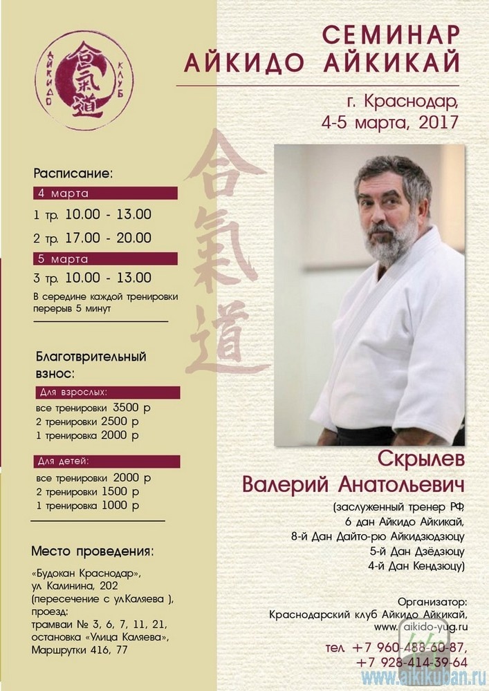 4-5 марта в центре боевых искусств «Краснодарский Будокан» по ул. Калинина 202, состоялся 5-й ежегодный учебно-аттестационный семинар под руководством Скрылёва В. А. Организатором мероприятия стал Краснодарский Клуб Айкидо Айкикай.
